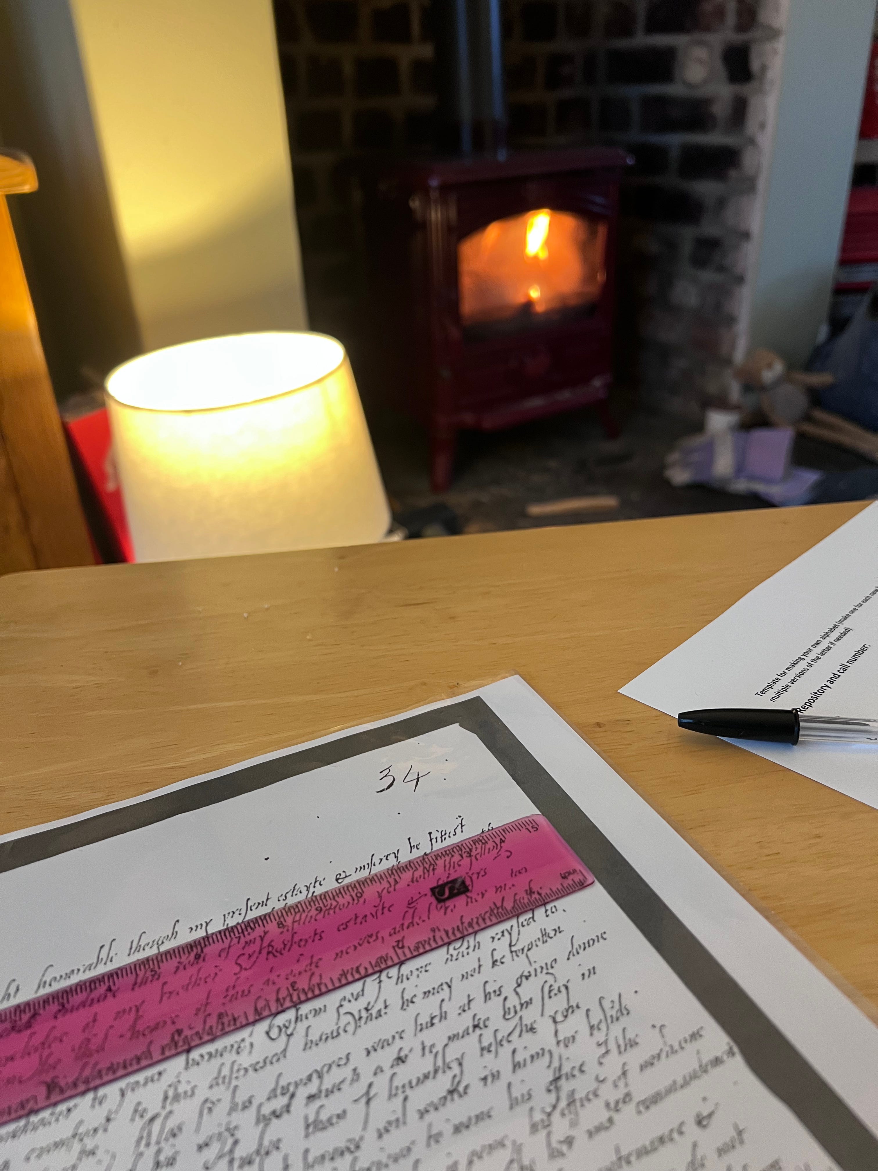 Later in the week I’m feeling brave enough to print out some of Margaret’s letters to test my skills. I light the fire and set my table up in front of it and quietly work my way through from start to finish, not checking the transcription until I reach the end. I feel like I’m cheating a bit. Her formal letters, and this is a formal letter to Robert Cecil, are written in a hand that is super neat and clear, each word has been slowly crafted. Her diary and her personal notes are very different: scratchy, quick and confident. This one feels almost innocent, almost a child’s hand, careful and full of gratitude and exaggerated love in the Elizabethan style. What a thrill to have worked it over myself. There are small smudges in places which feel like the pad of her wrist has pressed on the parchment. I press my hand in the same place on my own transcription and feel how she might be sitting, how her shoulders might be set while she writes. That image stays with me when I return to writing the book. It will find its way into the story, I will know her better because of it.